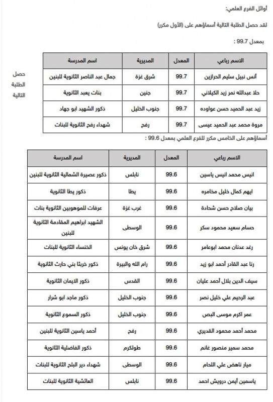 حصل الطلبة التالية أسماؤهم على الخامس مكرر للفرع العلمي بمعدل 99.6 :