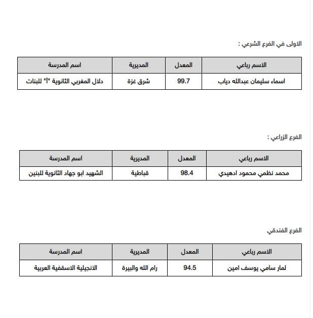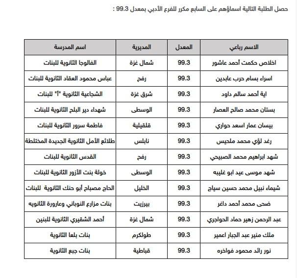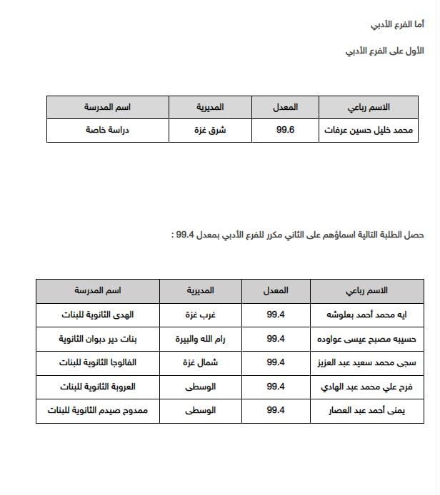 أسماء أوائل الثانوية العامة التوجيهي في فلسطين 2022 الفرع الأدبي:
