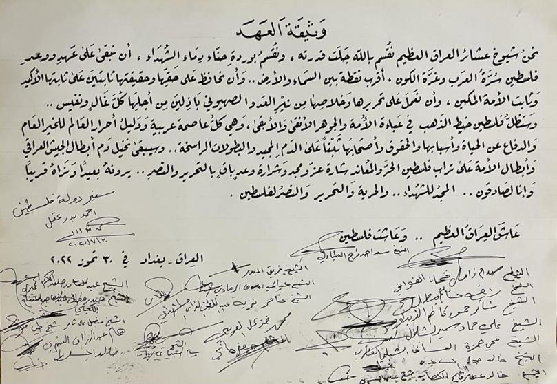 ووقع شيوخ من عشرين عشيرة عراقية وثيقة عهد خلال زيارتهم مقر سفارة دولة فلسطين لدى العراق ولقاء السفير احمد عقل، أكدوا من خلالها أن عشائر العراق ستبقى على عهد فلسطين وتحافظ على حقها وحقيقتها وتعمل على تحريرها وخلاصها من الاحتلال.