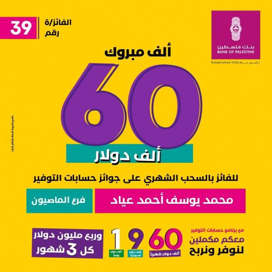أعلن بنك فلسطين عن الفائز بجائزة حسابات التوفير الشهرية، البالغ قيمتها 60 ألف دولار أمريكي، التي فاز بها السيد محمد يوسف أحمد عياد من فرع بنك فلسطين في المصيون بمدينة رام الله، وذلك ضمن حملته التي أطلقها البنك على برنامج حسابات التوفير في كافة فروعه المنتشرة بمختلف محافظات الوطن تحت شعار "معكم مكملين لنوفر ونربح 1960".