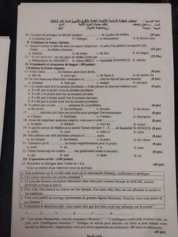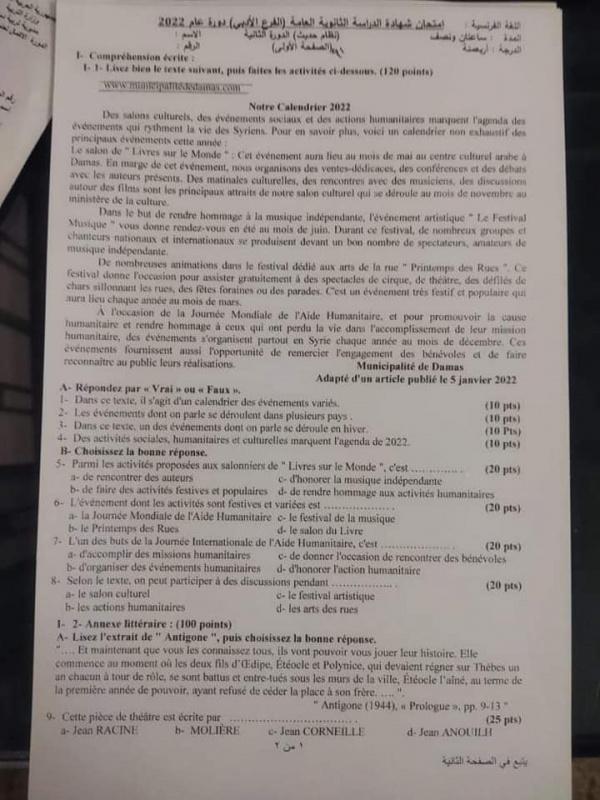 سوريا .. إجابات أسئلة امتحان اللغة الفرنسية للثانوية العامة البكالوريا 2022 الدورة الثانية