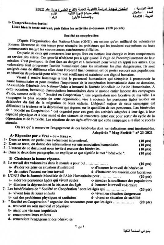 إجابات امتحان اللغة الفرنسية الدورة الثانية من شهادة الثانوية العامة البكالوريا 2022 في سوريا، حيث أعلنت مصادر تربوية عن الأسئلة والأجوبة النموذجية عقب انتهاء الاختبار الثاني في هذه الدورة التكميلية.