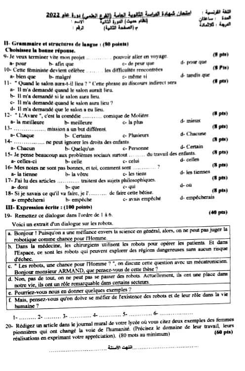 أجوبة امتحان اللغة الفرنسية 2022 الدورة الثانية: