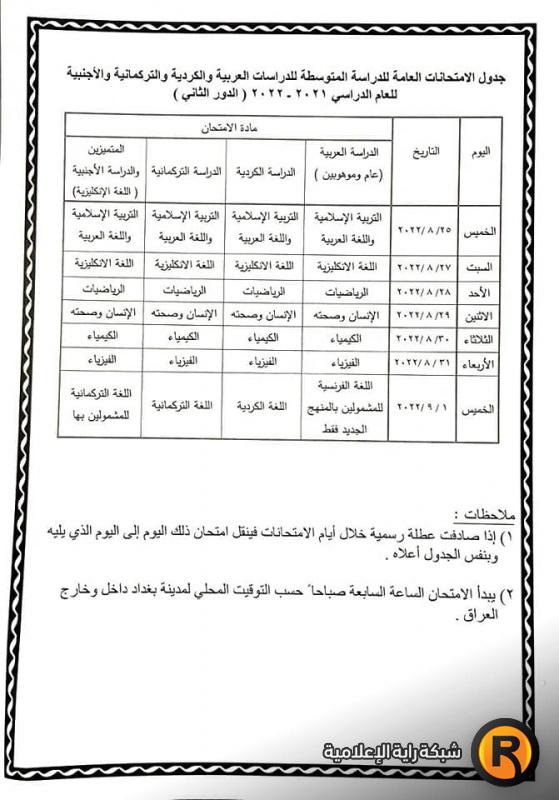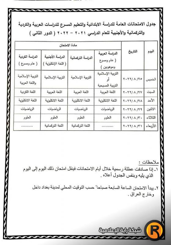 جدول امتحانات الدور الثاني للدراسة الابتدائية والمتوسطة 2022 في العراق