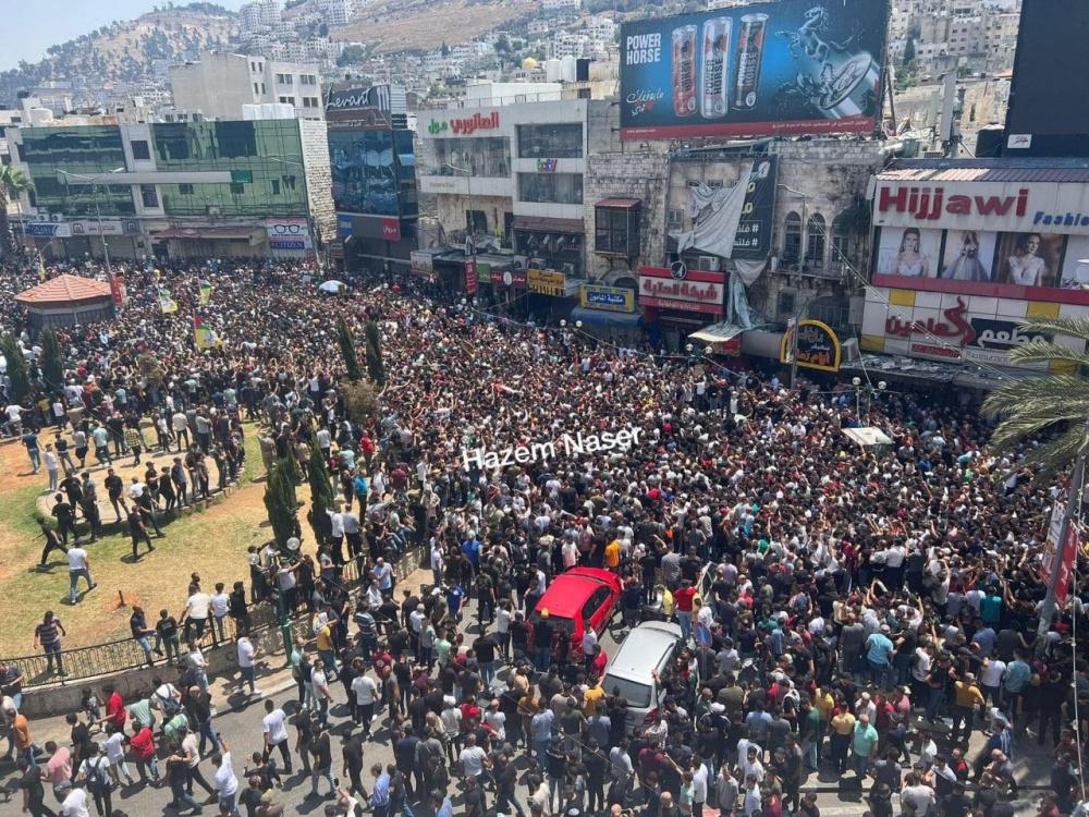 شيع عشرات الآلاف من أهالي نابلس والمدن والبلدات المجاورة، اليوم الثلاثاء، في موكب جنائزي مهيب، جثامين الشهداء الثلاثة الذين ارتقوا برصاص قوات الاحتلال خلال اقتحامها المدينة صباح اليوم.