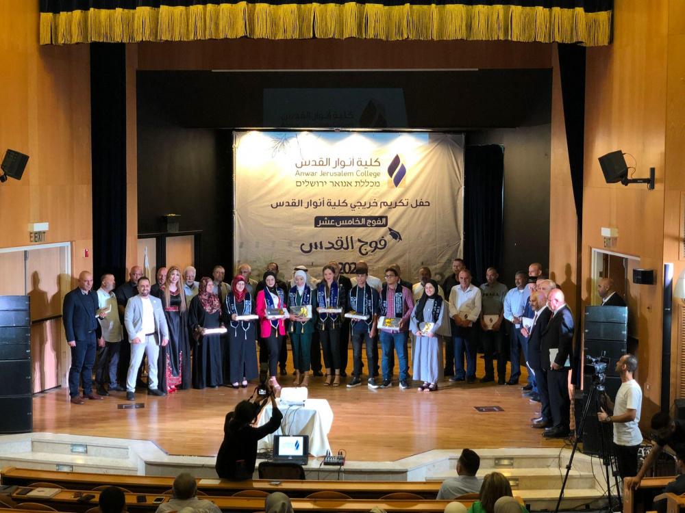 احتفلت كلية انوار القدس بتخريج كوكبة من طلابها بمختلف التخصصات في حفل مهيب اطلق على الخريجين فيه فوج القدس وهو الفوج الخامس عشر في مسرح فندق نوتردام في القدس وحضر الحفل اولياء امور الطلبة الخريجين وعدد من الشخصيات الاعتبارية المقدسية من رجال اعمال ومثقفين ووجهاء عشائر وتخلل الحفل العديد من الفقرات المميزة والنوعية التي نالت استحسان الحضور الذين عبروا عن فرحتهم واعجابهم بالحفل الضخم .
