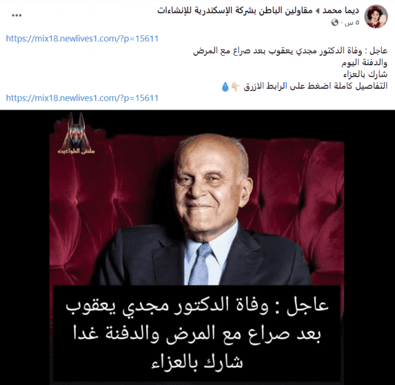 وتناقلت صفحات غير رسمية كما يظهر في الصورة أدناه، خبر "وفاة الدكتور مجدي يعقوب بعد صراع مع المرض والدفنة اليوم"، فيما أرفقت رابطا لموقع إلكتروني للدخول إليه من أجل الإطلاع على تفاصيل مزعومة.