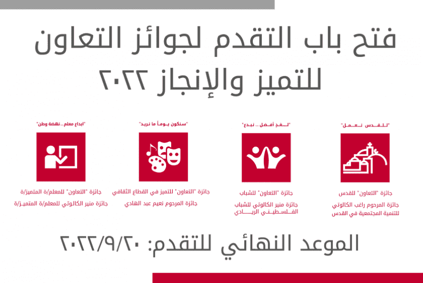 أعلنت التعاون عن إطلاق جوائزها السنوية للعام 2022، إيماناً منها بأهمية تقدير وتكريم إنجاز وإبداع الشعب الفلسطيني، وللحفاظ على العراقة والأصالة والجذور وخلق الروح التنافسية المبنية على الإنجاز والتميز ورسم صورة مشرفة لثقافة الانجاز وتشجيع وتمكين المؤسسات والأفراد والشباب والمعلمين الفلسطينيين.