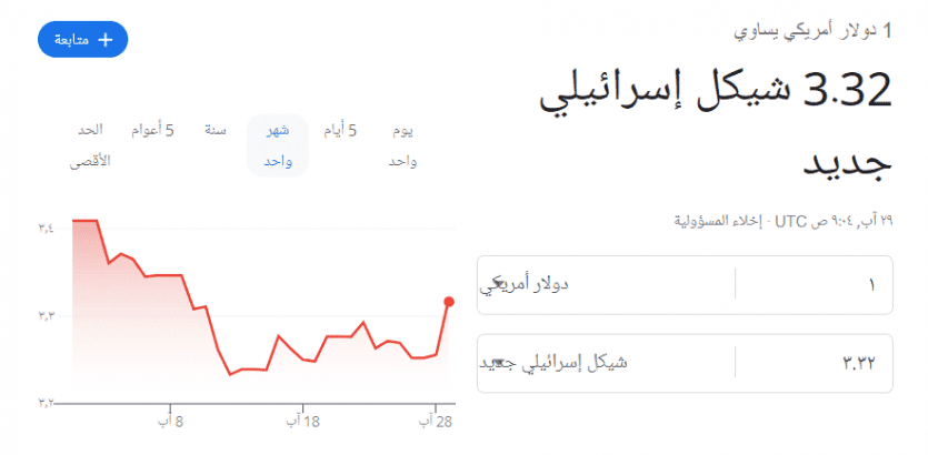 ووصل سعر صرف الدولار مقابل الشيكل الاسرائيلي، الآن، 3.32 شيكل.