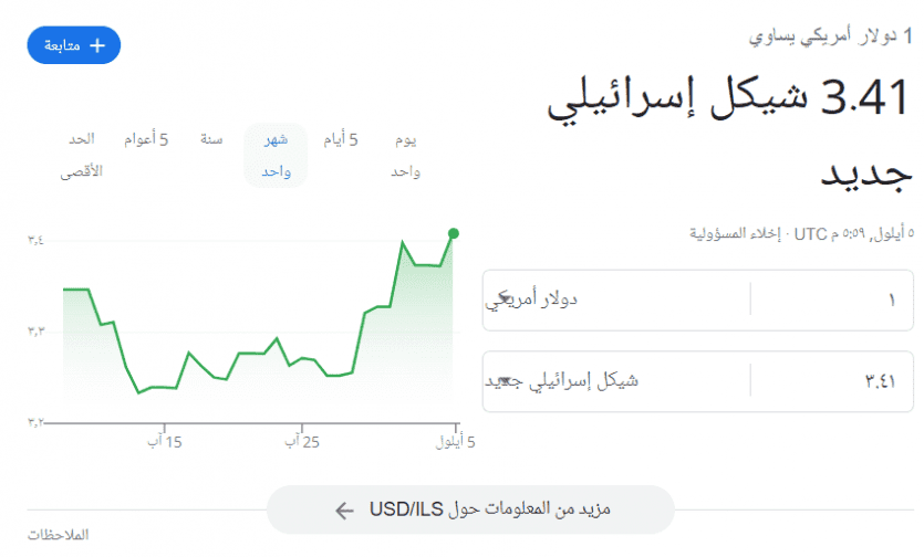 شهد سعر صرف الدولار الأمريكي مقابل الشيكل الإسرائيلي ارتفاعًا ملحوظًا، حيث يتم صرف الدولار مساء اليوم الاثنين، بسعر 3.41 شيكل إسرائيلي.