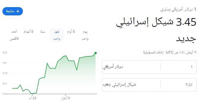 شهد سعر صرف الدولار مقابل الشيكل، ظهر اليوم الاثنين، 19 سبتمبر 2022، ارتفاعا جديدا في التداولات المصرفية المسائية، مقارنة بما كان عليه في ساعات الصباح الأولى.