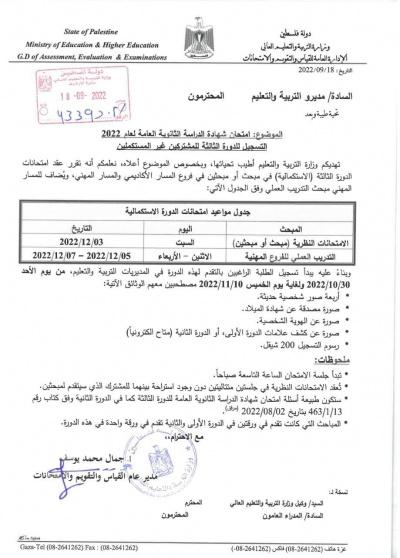 كشفت وزارة التربية والتعليم الفلسطينية، اليوم الأربعاء، عن موعد بدء التسجيل وعقد امتحانات الثانوية العامة التوجيهي الدورة الثالثة 2022.
