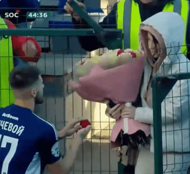 خطف لاعب فريق أورينبورغ، فلاديمير سيتشيفوي، الأضواء خلال مباراة فريقه أمام ضيفه سوتشي (4-1) اليوم السبت، ضمن الجولة الـ11 من الدوري الروسي الممتاز لكرة القدم، بتقدمه بطلب الزواج.