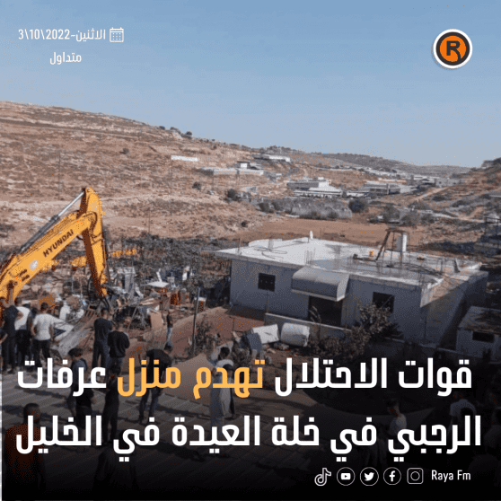 وأوضحت مصادر محلية، أن قوات الاحتلال ترافقها عدد من الآليات العسكرية وجرافات اقتحمت خلة العيدة، وهدمت المنزل الذي يقطنه المواطن عرفات نبيل الرجبي برفقة عائلته المكونة من ثمانية انفار، وتبلغ مساحته 120 مترا مربعا تقريبا.