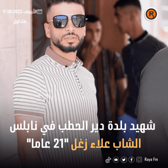 وأعلنت وزارة الصحة، استشهاد الشاب علاء ناصر أحمد زغل ٢١ عاما متأثراً بإصابته برصاصة في الرأس أطلقها عليه جيش الاحتلال في دير الحطب شرق نابلس.