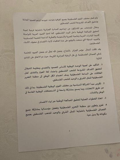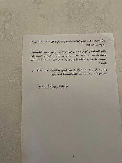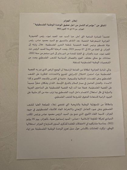 وأنهت الفصائل الفلسطينية، مساء أمس الأربعاء 12 أكتوبر، حواراتها في الجزائر والتي تسعى للوصول إلى وثيقة وطنية تنهي الانقسام وتحقق المصالحة الفلسطينية .