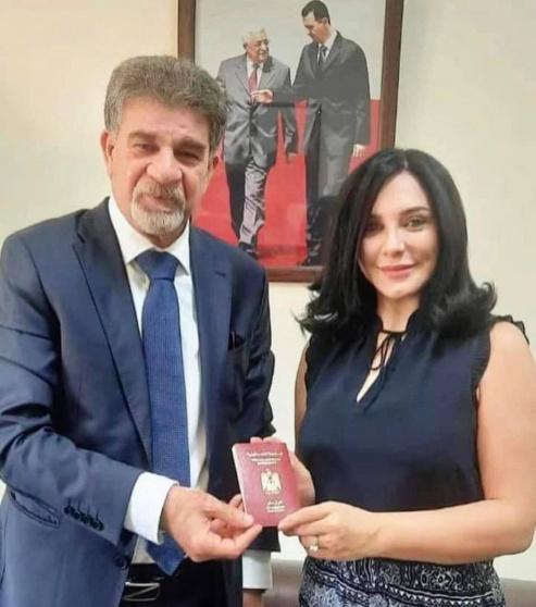 وأرفقت الفنانة تدوينتها بصورة تحمل فيها جوازها الفلسطيني، إلى جانب مدير عام دائرة العلاقات العربية بمنظمة التحرير الفلسطينية أنور عبد الهادي. وتبدو في العمق صورة تجمع الرئيس الفلسطيني محمود عباس مع رأس النظام السوري بشار الأسد.
