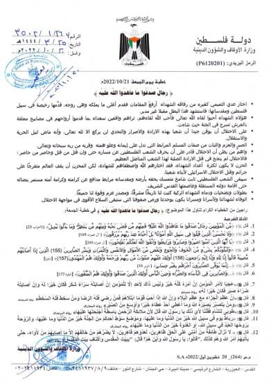 أصدرت وزارة الأوقاف والشؤون الدينية، اليوم الخميس، تعميما بخصوص صلاة يوم غد الجمعة، دعت فيه خطباء المساجد خلال خطبة الجمعة، للحديث عن الشهيد عدي التميمي، من خلال عنوان "رجال صدقوا ما عاهدوا الله عليه".