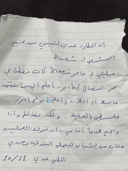 وجاء في وصية عدي: "أنا المطارد عدي التميمي من مخيم الشهداء شعفاط، عمليتي في حاجز شعفاط كانت نقطة في بحر النضال الهادر".