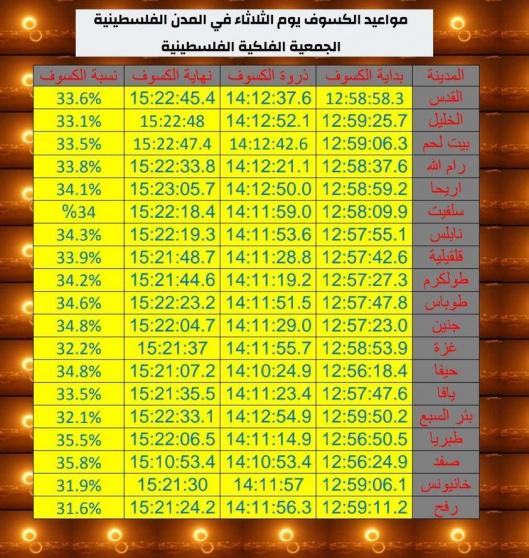 من جهتها، قالت الجمعية الفلكية الفلسطينية، إن الكسوف سيبدأ من أعلى يسار الشمس، ثم يغطس جنوبا حتى يغطي 33.6% من قرص الشمس في مدينة القدس، و35.7% في أقصى الشمال، و29.8 في أقصى الجنوب، ومن المتوقع أن يستمر الكسوف في سماء فلسطين مدة ساعتين وثلث تقريبا.