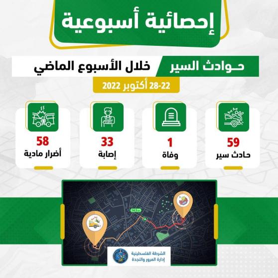 أعلنت شرطة المرور بغزة، اليوم السبت، تسجيل حالة وفاة، و33 إصابة خلال 59 حادثا مروريا الأسبوع الماضي (من 22 إلى 28 أكتوبر/ تشرين أول الجاري).