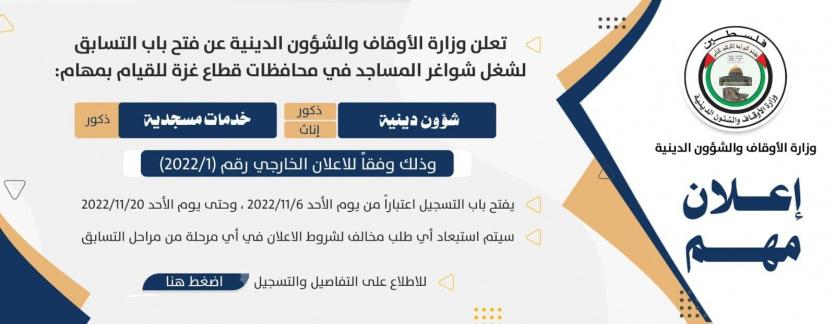 أعلنت وزارة الاوقاف في غزة، مساء اليوم الأحد، توفيرها 400 فرصة عمل على بند التشغيل المؤقت في مجالّي الشؤون الدينية "للذكور والإناث"، والخدمات المسجدية "للذكور فقط".