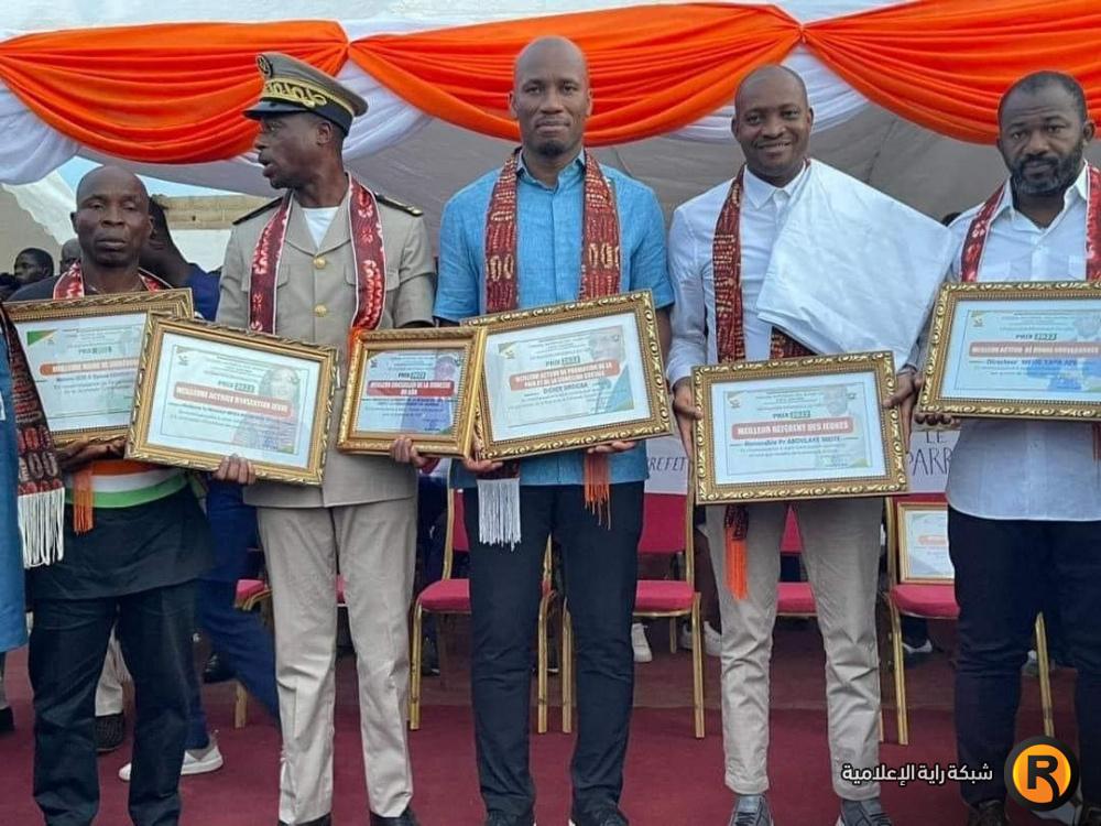 وسلم ديديه دروجبا برفقة الفرنسي المعتزل زين الدين زيدان مدرب ريال مدريد الاسباني سابقا، جائزة الكرة الذهبية إلى الفرنسي كريم بنزيمة خلال حفل حضره عشرات النجوم.