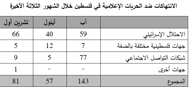 شهد شهر تشرين أول الماضي ارتفاعا في اجمالي عدد الانتهاكات ضد الحريات الإعلامية في فلسطين حيث بلغت 81 اعتداء، مقارنة بما مجموعه 57 اعتداء وثقت خلال شهر أيلول الذي سبقه.