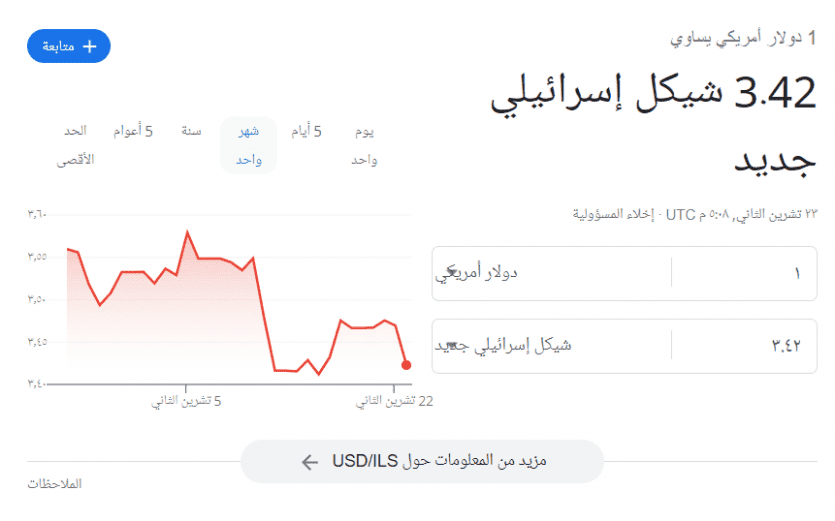 ووصل سعر صرف الدولار مقابل الشيكل الآن في قطاع غزة والضفة الغربية إلى 3.42 شيكل، فيما كان في ساعات الصباح 3.46.