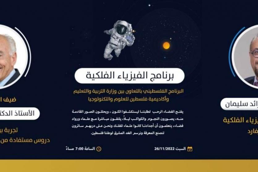 تطلق وزارة التربية والتعليم بالتعاون مع أكاديمية فلسطين للعلوم والتكنولوجيا، في الساعة السابعة من مساء اليوم السبت، افتراضياً، برنامج فلسطين للفيزياء الفلكية؛ بمشاركة من علماء فلسطينيين وعرب.