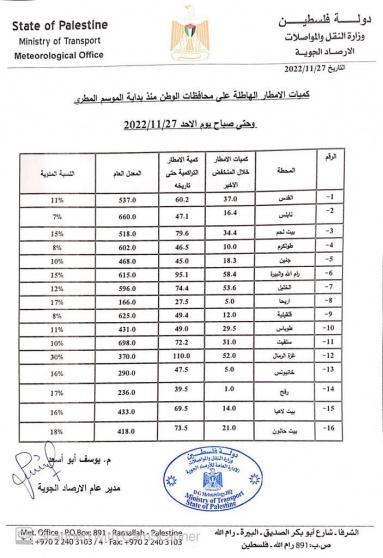 أعلنت دائرة الارصاد الجوية الفلسطينية، كميات الأمطار التي هطلت على كافة محافظات الوطن منذ بداية الموسم المطري وحتى صباح يوم الأحد 27/11/2022، بعد أن تأثرت البلاد بحالة جوية ماطرة.