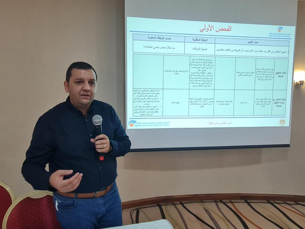 بدوره، قدم مدير سياسات الشراء في المجلس م. أنس سمحان عرضاً لمعايير التقييم والتأهيل في مراحل التقييم الثلاثة الواردة في قانون ونظام الشراء واستعراض حالات الاخفاق الممكنة وطرق التعامل معها، ومناقشتها مع الحضور، بغية الوصول إلى معايير واضحة ومتفق عليها، يتم صياغتها من قبل المجلس لتعميمها على الجهات المشترية للعمل بموجبها.
