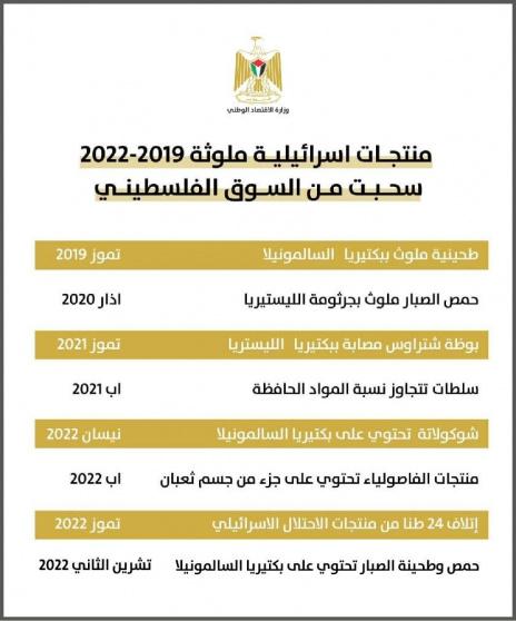 أعلنت وزارة الاقتصاد الوطني، صباح اليوم الإثنين، عن قائمة منتجات الاحتلال "الإسرائيلي" التي سحبت من السوق منذ 2019 وحتى 2022 نتيجة تلوثها.
