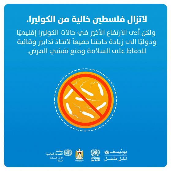وأوضحت الوزارة في بيان مقتضب لها، أن فلسطين خالية من الكوليرا لكن أدى الارتفاع الأخير في حالات الكوليرا إقليميًا ودوليًا الى زيادة حاجتنا جميعاً لاتخاذ تدابير وقائية للحفاظ على السلامة ومنع تفشي المرض.