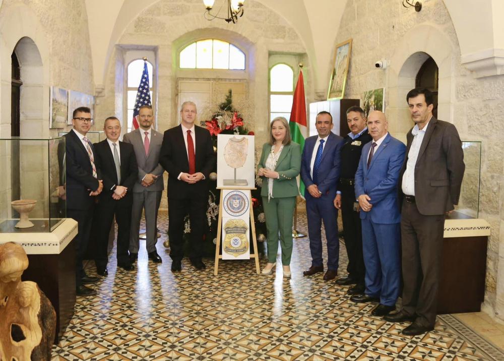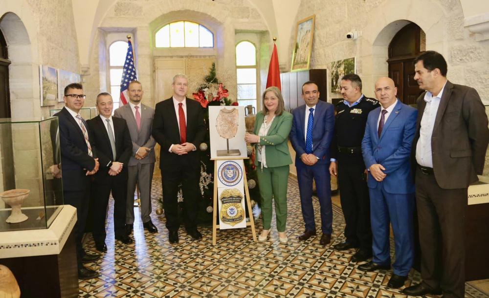 تسلمت وزيرة السياحة والآثار رولا معايعة، من رئيس المكتب الأميركي للشؤون الفلسطينية جورج نول، ومسؤول دائرة تهريب الآثار في نيويورك ماثويس بوكدانوس، قطعة أثرية نادرة تم تهريبها من فلسطين إلى أميركا.