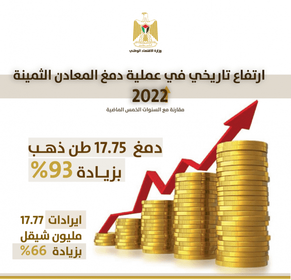 وبينت وزارة الاقتصاد الوطني، في تقريرها السنوي، ان إجمالي الإيرادات المحصلة من قبل مديرية دمغ ومراقبة المعادن الثمينة جراء عملية دمغ المصوغات الذهبية، والتي تحمل الدمغة الفلسطينية "قبة الصخرة"، ما قيمته 17.77 مليون شيقل، بزيادة ما نسبته 66% مقارنة مع السنوات الخمس الماضيةً.