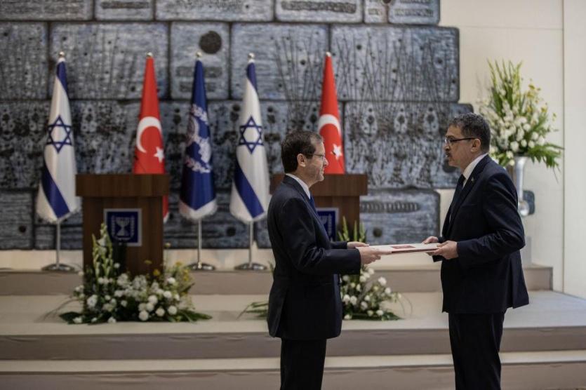 وتسلم هرتسوغ أوراق اعتماد السفير التركي الجديد لدى تل أبيب، شاكر أوزكان تورونلار، في ديوان الرئيس الإسرائيلي في القدس، في مراسم شملت ترديد النشيد الوطني التركي، وقال هرتسوغ: "أنا متأكد من أننا سنعمل جميعا على تعزيز العلاقات بين البلدين".