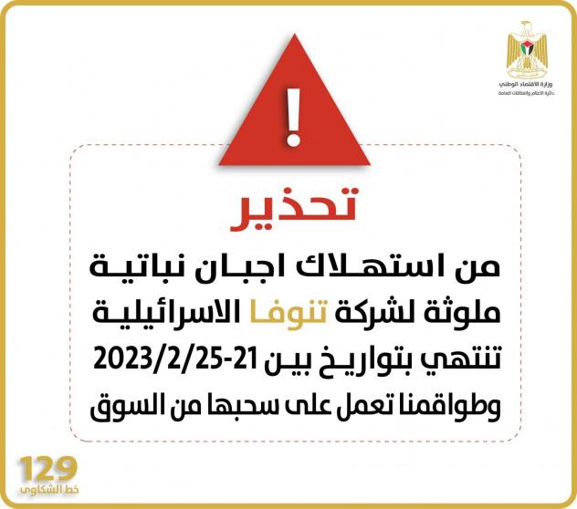 حذرت وزارة الاقتصاد الوطني، اليوم الخميس، جمهور المستهلكين من استهلاك اجبان نباتية ملوثة شركة تنوفا الاسرائيلية نظراً لاحتوائها على شظايا معدنية اثناء عملية تصنيع المنتج مما يشكل خطر على صحة وسلامة المستهلك.