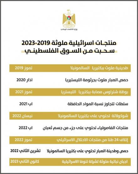 يذكر ان وزارة الاقتصاد الوطني سحبت بين الاعوام 2019-2023 عدد من المنتجات الاسرائيلية الملوثة تشكل خطرا على صحة و سلامة المواطنين بعضها يحتوي على بكتيريا السالمونيلا وجرثومة الليستيريا واخرى تحتوي على جزء من جسم ثعبان وملوثة اثناء عملية التصنيع.