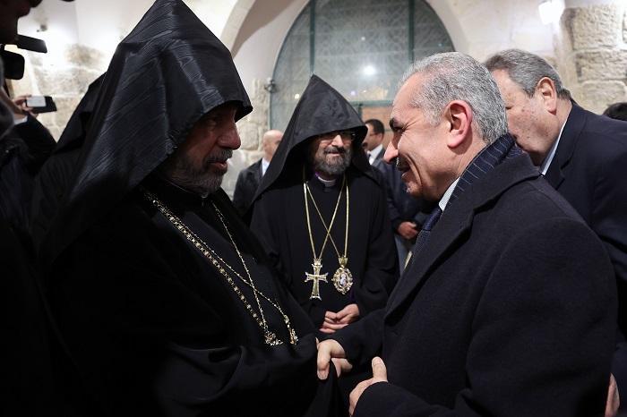 وهنأ اشتية باسم الرئيس محمود عباس ومجلس الوزراء أبناء شعبنا من الأرمن بمناسبة حلول عيد الميلاد المجيد، قائلا: "نحتفل تحت سقف واحد في بيت لحم مهد السيد المسيح، توأم القدس معراج سيدنا محمد عليه الصلاة والسلام".