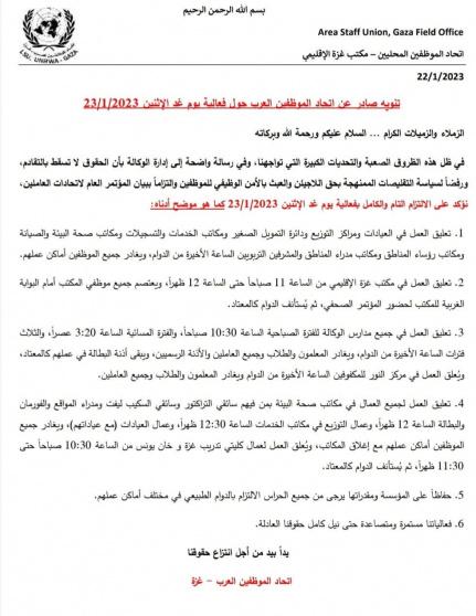 أعلن اتحاد الموظفين في وكالة الغوث وتشغيل اللاجئين "الأونروا"، تعليق الدراسة والعمل يوم غد الاثنين الموافق 23/1/2023 رفضاً لسياسة التقليصات الممنهجة بحق اللاجئين، والعبث بالأمن الوظيفي .