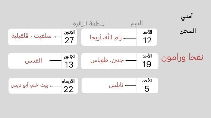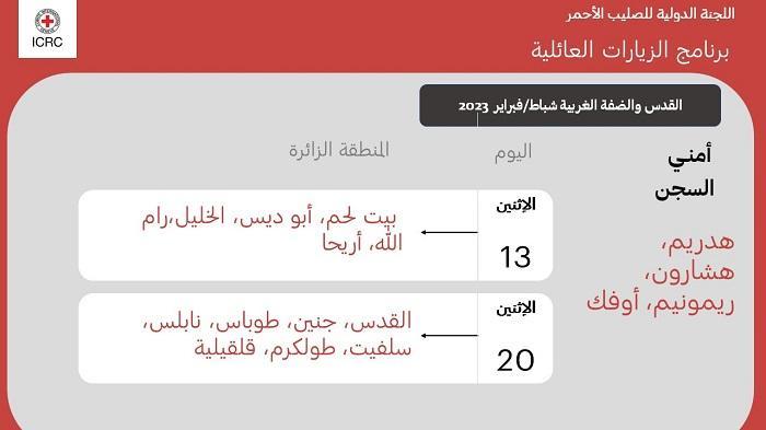أعلنت اللجنة الدولية للصليب الأحمر، مساء الأحد، عن الجدول المحدث لزيارات الأسرى خلال شهر شباط/فبراير المقبل.