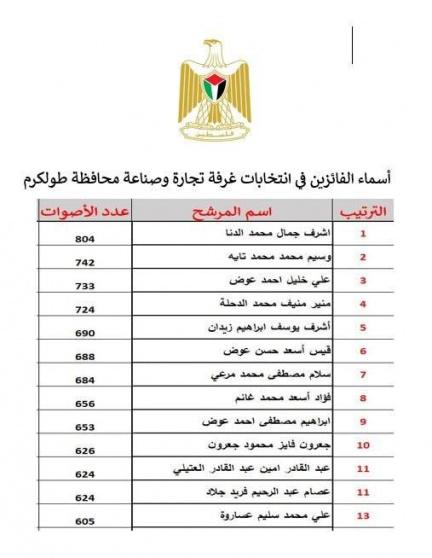 وفيما يلي أسماء الفائزين في انتخابات غرفة تجارة وصناعة محافظة طولكرم: