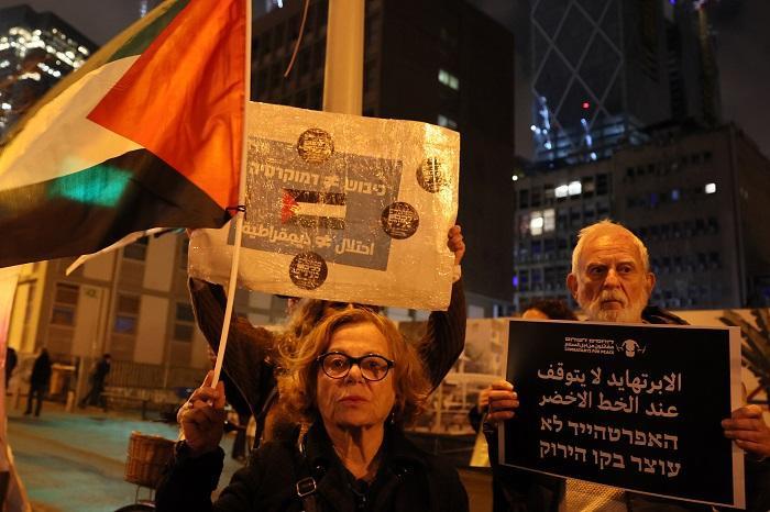 ورفع المشاركون يافطات كتب عليها شعارات بالعبرية والإنجليزية والعربية، من ضمنها: "حياة الفلسطينيين مهمة"، "شعب يحتل شعب آخر لا يمكن أن يكون حرا"، "نتنياهو، سموتريتش، بن غفير، تهديد للسلام في العالم"، و"ياريف ليفين عدو للديمقراطية"، و"حان وقت إسقاط الديكتاتور" و"حكومة العار"، و"بيبي (نتنياهو) فاقد للأهلية"، و"الابارتهاد لا يتوقف عند الخط الأخضر".