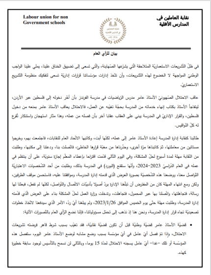 وقالت النقابة انها طالبت "إدارة المدرسة إعادة الأستاذ عامر إلى عمله، لكنّها أبت، وكاتبها الاتّحاد العام للنقابات، واجتمعت بهم، وخرجوا مستائين من معاملتها، ثمّ كاتبناها مرّة أخرى، وحذّرناها من مغبّة قرارها الخاطئ، فاتّصلت بنا، ودعتنا إلى مكتبها، وطلبت من النّقابة مهلة لمدة أسبوع لحلّ المشكلة، وفي اليوم التّالي قدّمت اقتراحا بإعطاء المعلّم إجازة سنويّة، على أن ينتظم في عمله في العام الدّراسيّ 2023-2024، وأنّها ستقنع (البورد) في المدرسة بذلك، وطلبت من أحد الشّخصيات الاعتباريّة التّواصل معنا، ووضعنا هذه الشّخصيّة بصورة العرض الّذي قدمته إدارة المدرسة، وموافقتنا عليه، فاستحسن موقف الطرفين، ولكن ومع انتهاء المهلة كان من المفترض أن تبلّغنا الإدارة بردّ أصولا بأدبيّات الاتّصال والتّواصل، لكنّها لم تفعل، فبعثنا لها رسالة، فتجاهلتها، واتّصلنا بها عبر المحمول، فتجاهلت، وتدخلت وزارة العمل لحلّ المشكلة بناء على العرض الّذي قدّمته إدارة المدرسة، وطلبت مهلة حتّى يوم الخميس الموافق 26/1/2023، ولم يبلغنا أيّ ردّ، الأمر الّذي سيدفعنا لاتّخاذ خطوات تصعيديّة تجاه قرار إدارة المدرسة، ونحن هنا إذ نذهب إلى تحمّل مسؤولياتنا"