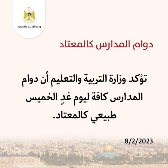 من جهتها، أعلنت وزارة التربية والتعليم في غزة عن انتظام الدوام المدرسي ليوم غدٍ الخميس 9 فبراير 2023 في كافة المدارس بالقطاع.