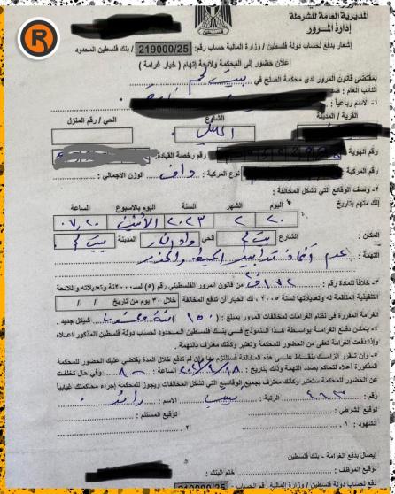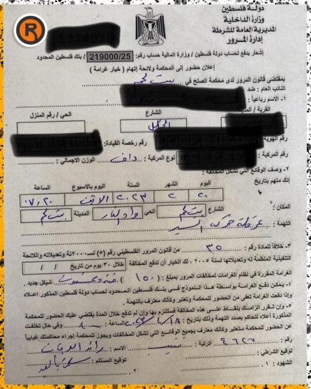 وحصلت "رايـــة" على صورة من المخالفات التي أصدرتها الشرطة الفلسطينية بحقه، وهي كالتالي: عرقلة حركة السير، تنزيل عن الشارع كمركبة غير مؤهلة للسير، بالإضافة إلى مخالفة عدم أخذ تدابير الحيطة والحذر.