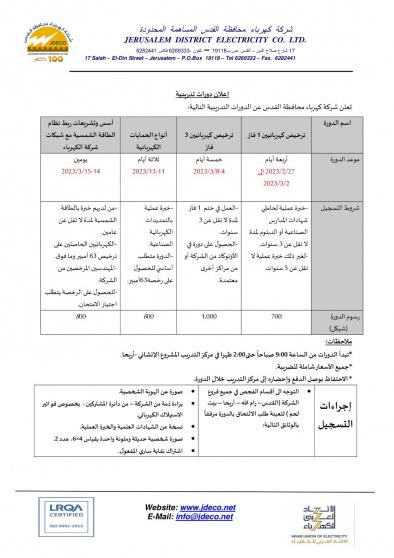 اعلان صادر عن شركة كهرباء محافظة القدس حول بدء التسجيل للدورات