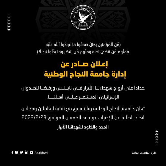 أعلنت جامعة النجاح الوطنية في نابلس، مساء اليوم الأربعاء، تعليق الدراسة غداً الخميس، حداداً على أرواح الشهداء العشرة في نابلس.