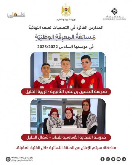 ومما هو بالإشارة جدير أن هذه المسابقة التي تنظمها وزارة التربية والتعليم ومؤسسة ياسر عرفات بالتعاون مع هيئة الإذاعة والتلفزيون تهدف إلى تأصيل الوعي بالرموز الوطنية، وتعزيز الرواية الفلسطينية، وغرس القيم الوطنية في نفوس الناشئة، وقد شهدت في دورها نصف النهائي تنافساً كبيراً بين المشاركين/ات.